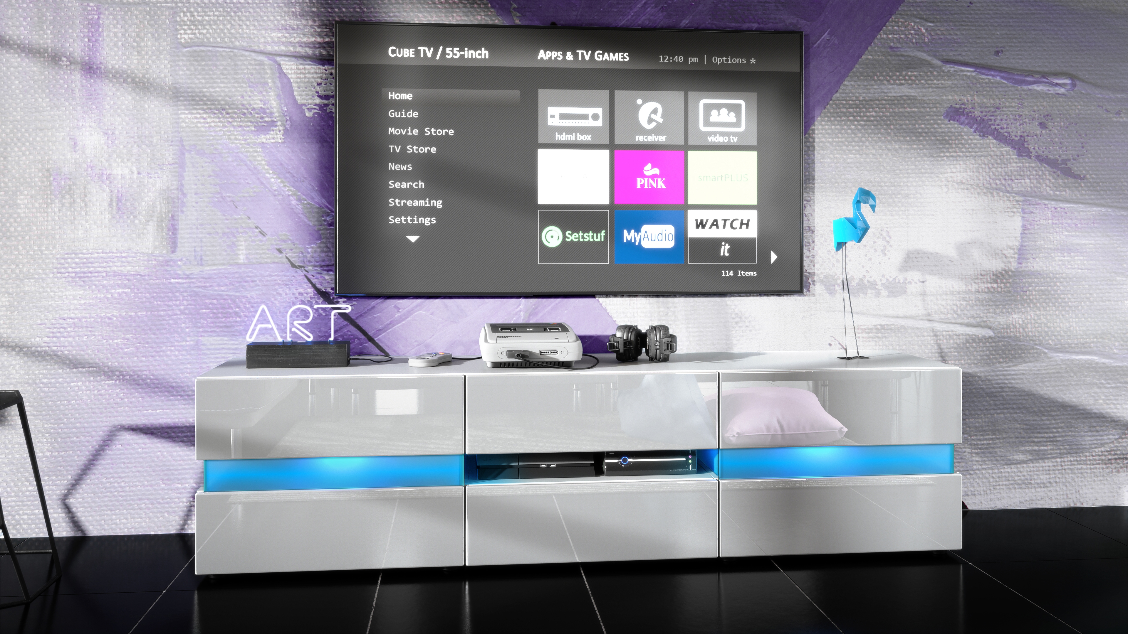 Das TV-Lowboard Flow eignet sich als TV-Schrank für jeden Wohnraum. Der geräumige TV-Tisch Flow präsentiert sich als praktisches Möbelstück mit modernem Design, hergestellt in Deutschland. Das Sideboard für den TV ist mit zwei Türen, dahinter jeweils zwei Fächern mit Einlegeboden, einer Schublade und einer praktischen Geräteklappe ausgerüstet. Eine Rückwand in Holzoptik aus Hartfaserplatten mit Aussparungen hinter der Klappe ist im Lieferumfang enthalten. Dadurch ergibt sich hinter der Klappe der perfekte Platz für Ihren Receiver und weitere Unterhaltungselektronik. Der große Oberboden bietet auch für größere Fernseher ausreichend Platz.