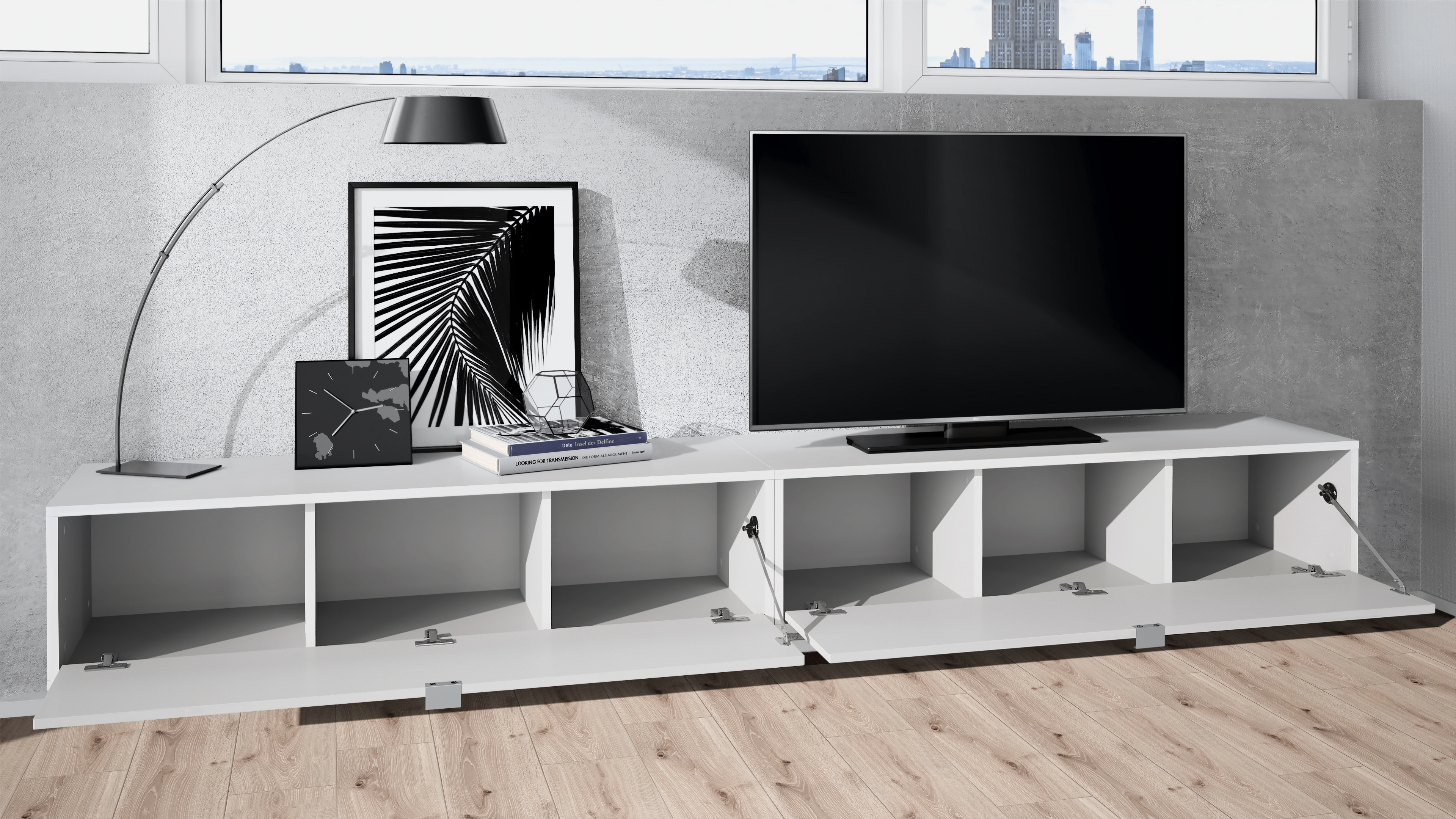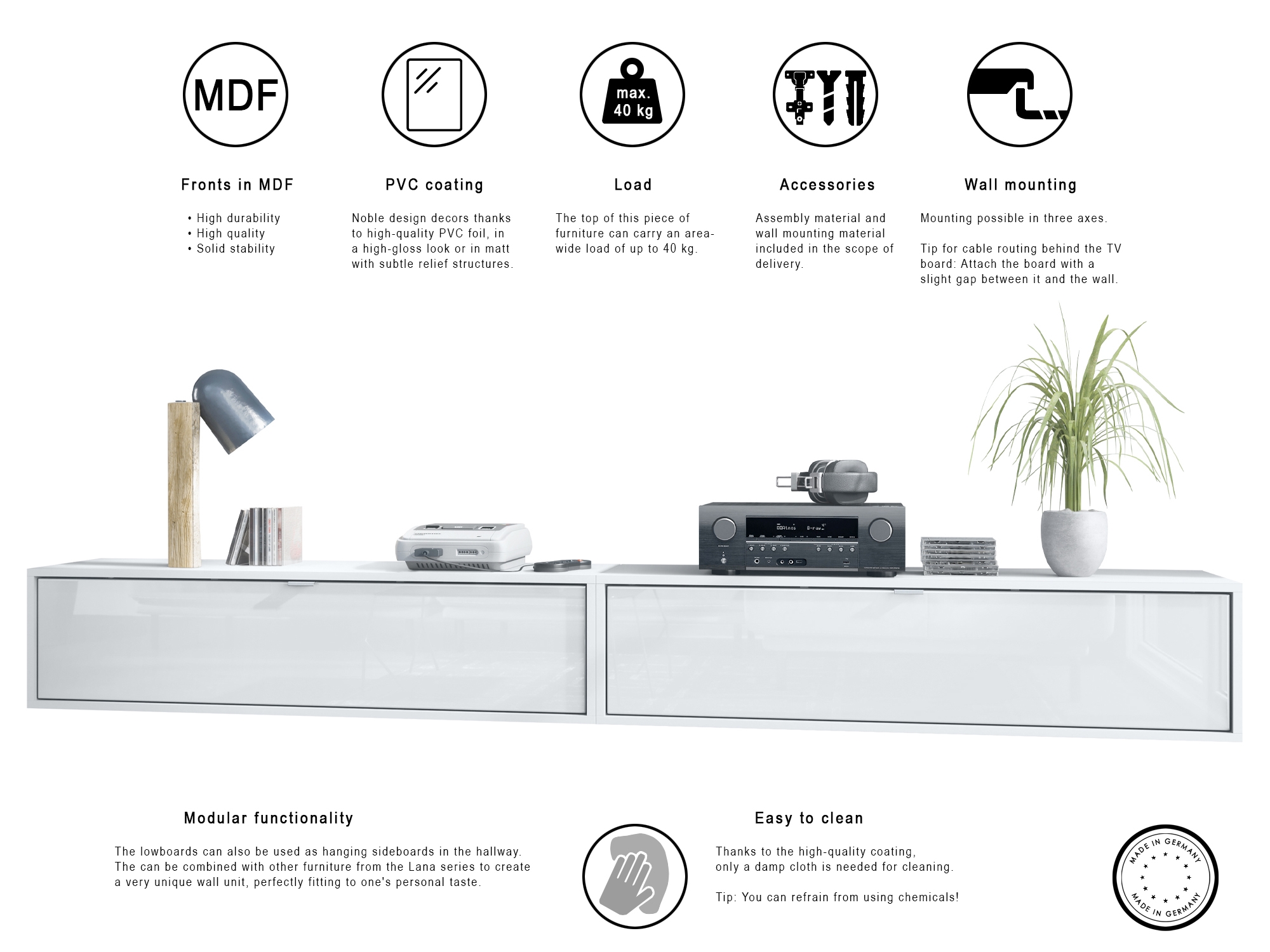 So viel mehr als nur ein TV Board: Das Hängeelement Lana demonstriert, was „Multifunktionalität“ bedeutet. In erster Linie als Lowboard gedacht, kann es genauso gut als Sideboard, Küchenschrank, Büro- oder Dielenmöbel genutzt werden. Es stellt die perfekte Ergänzung für jeden Haushalt dar.