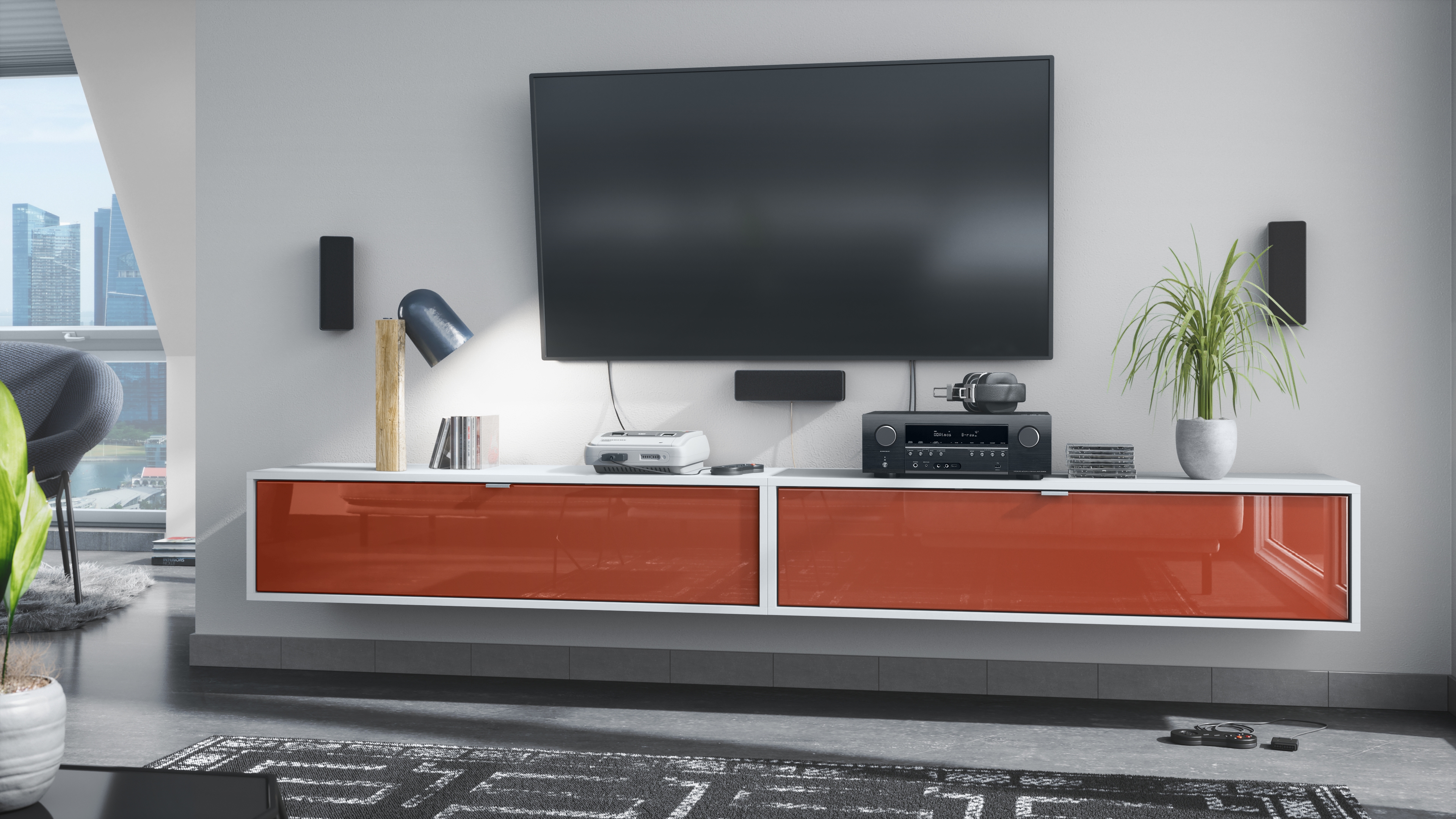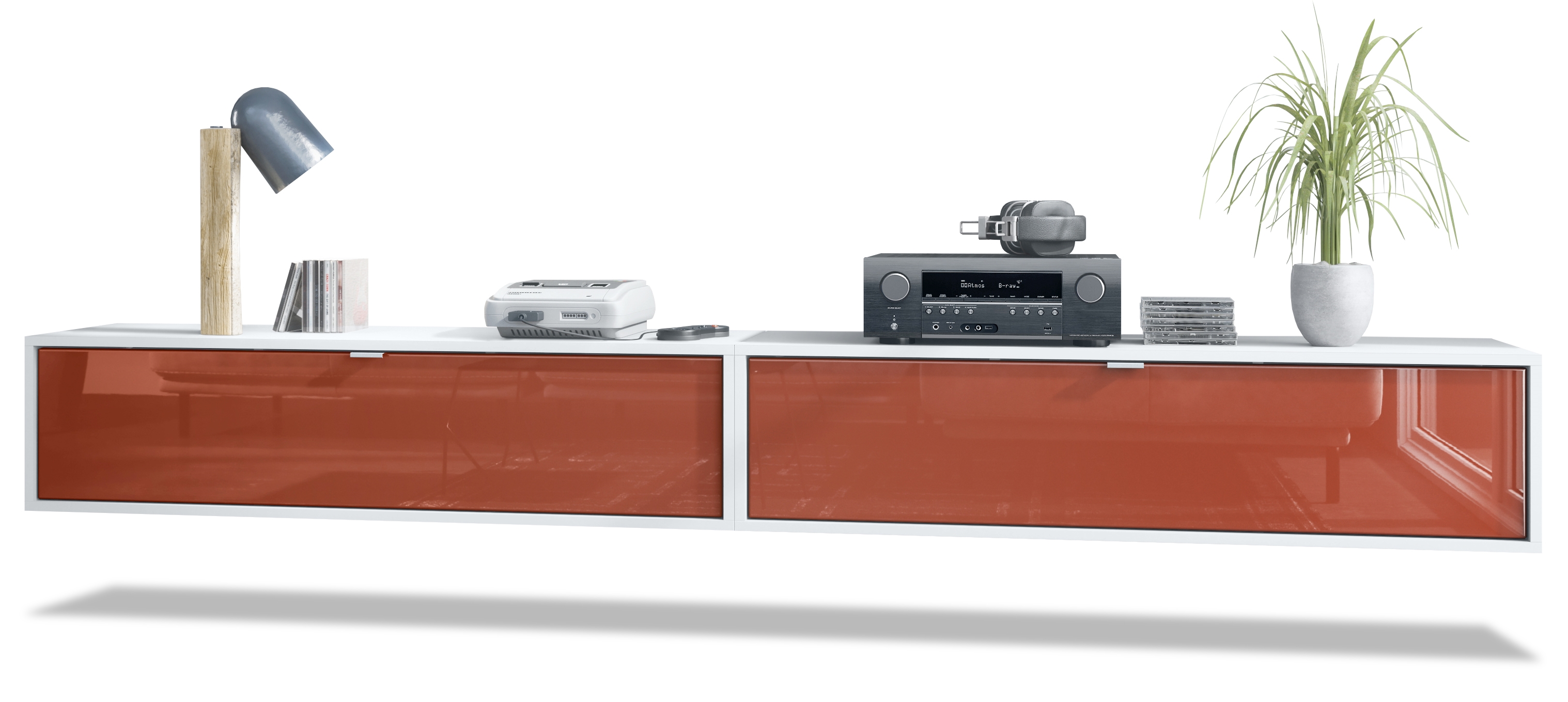 Der Korpus des TV Boards hat die Farbe Weiß matt. Um dem Möbelstück einen futuristischen Stil zu verleihen, wird es hängend an der Wand befestigt. So kann man es nahezu überall im Haus anbringen. Dies ist gerade dann praktisch, wenn auf dem Boden nicht genügend Platz für stehende Möbel verfügbar ist.