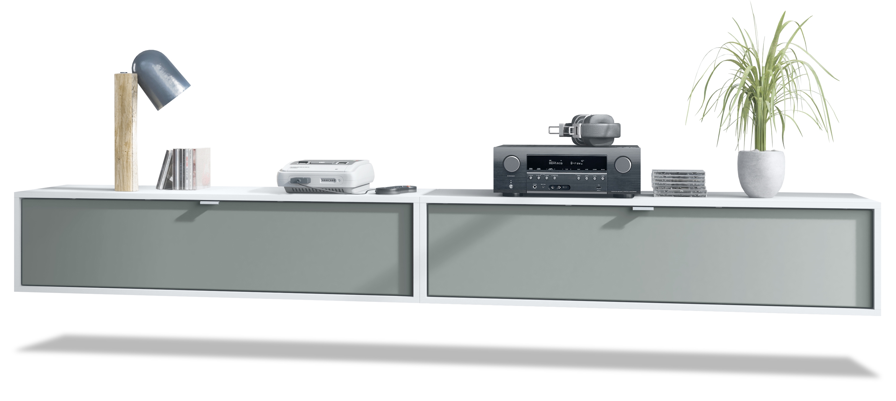 Der Korpus des TV Boards hat die Farbe Weiß matt. Um dem Möbelstück einen futuristischen Stil zu verleihen, wird es hängend an der Wand befestigt. So kann man es nahezu überall im Haus anbringen. Dies ist gerade dann praktisch, wenn auf dem Boden nicht genügend Platz für stehende Möbel verfügbar ist.