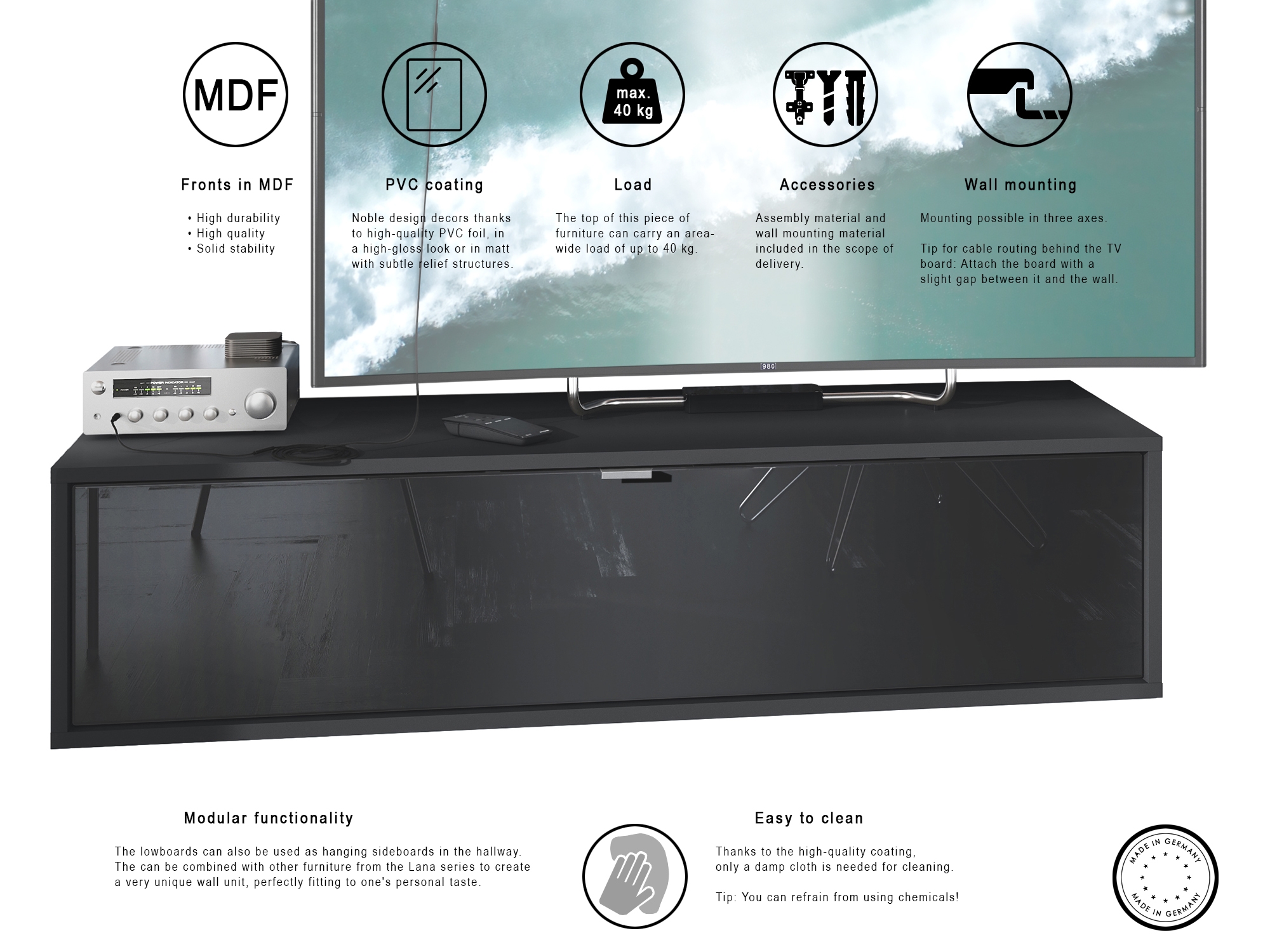 So viel mehr als nur ein TV Board: Das Hängeelement Lana demonstriert, was „Multifunktionalität“ bedeutet. In erster Linie als Lowboard gedacht, kann es genauso gut als Sideboard, Küchenschrank, Büro- oder Dielenmöbel genutzt werden. Es stellt die perfekte Ergänzung für jeden Haushalt dar.