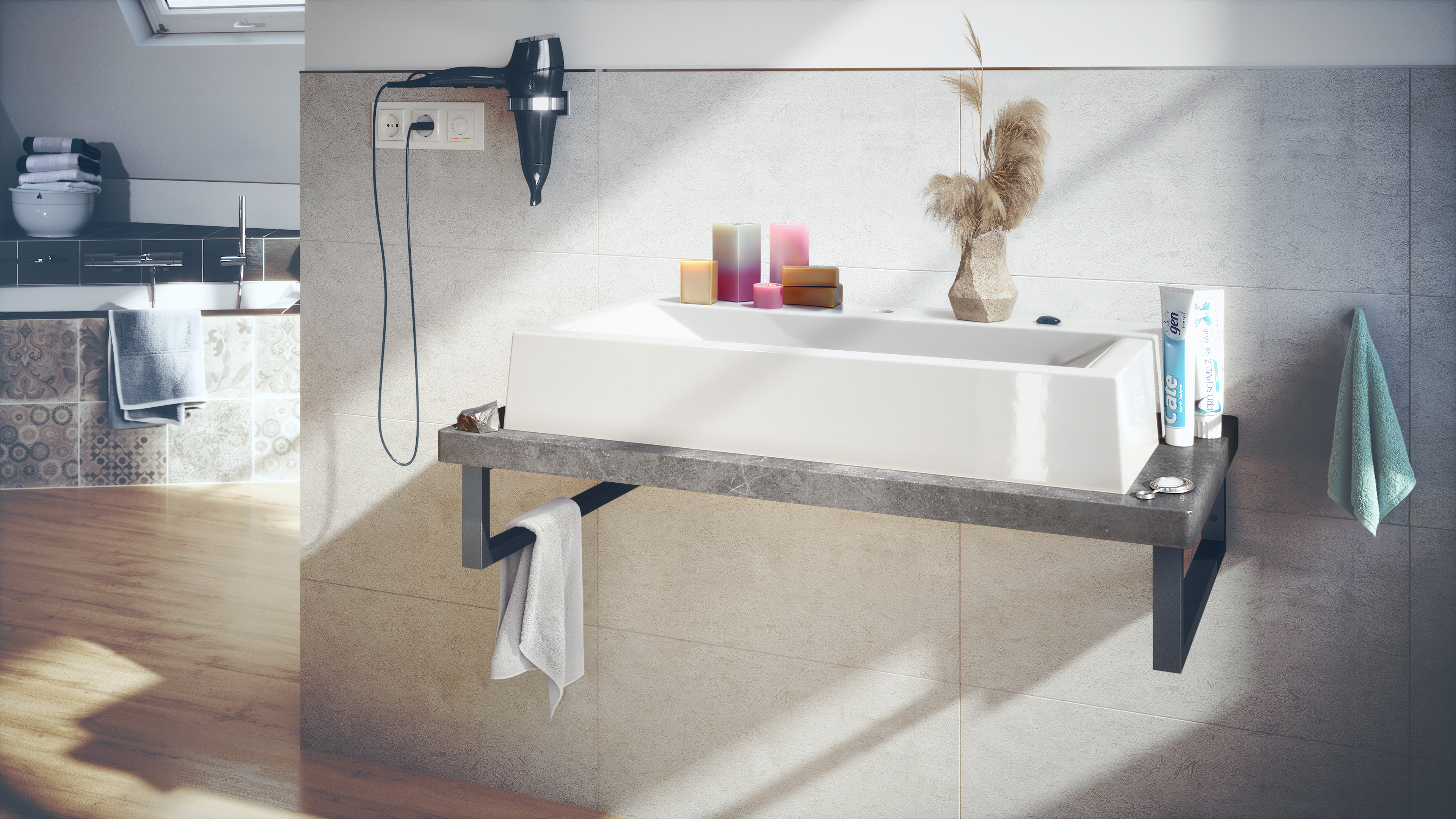 Optisch sehr ansprechend, bietet es die Möglichkeit Badutensilien des täglichen Bedarfs, zum Beispiel Seifenspender oder Zahnpasta, bequem abzustellen, wodurch die Nutzung vereinfacht wird.