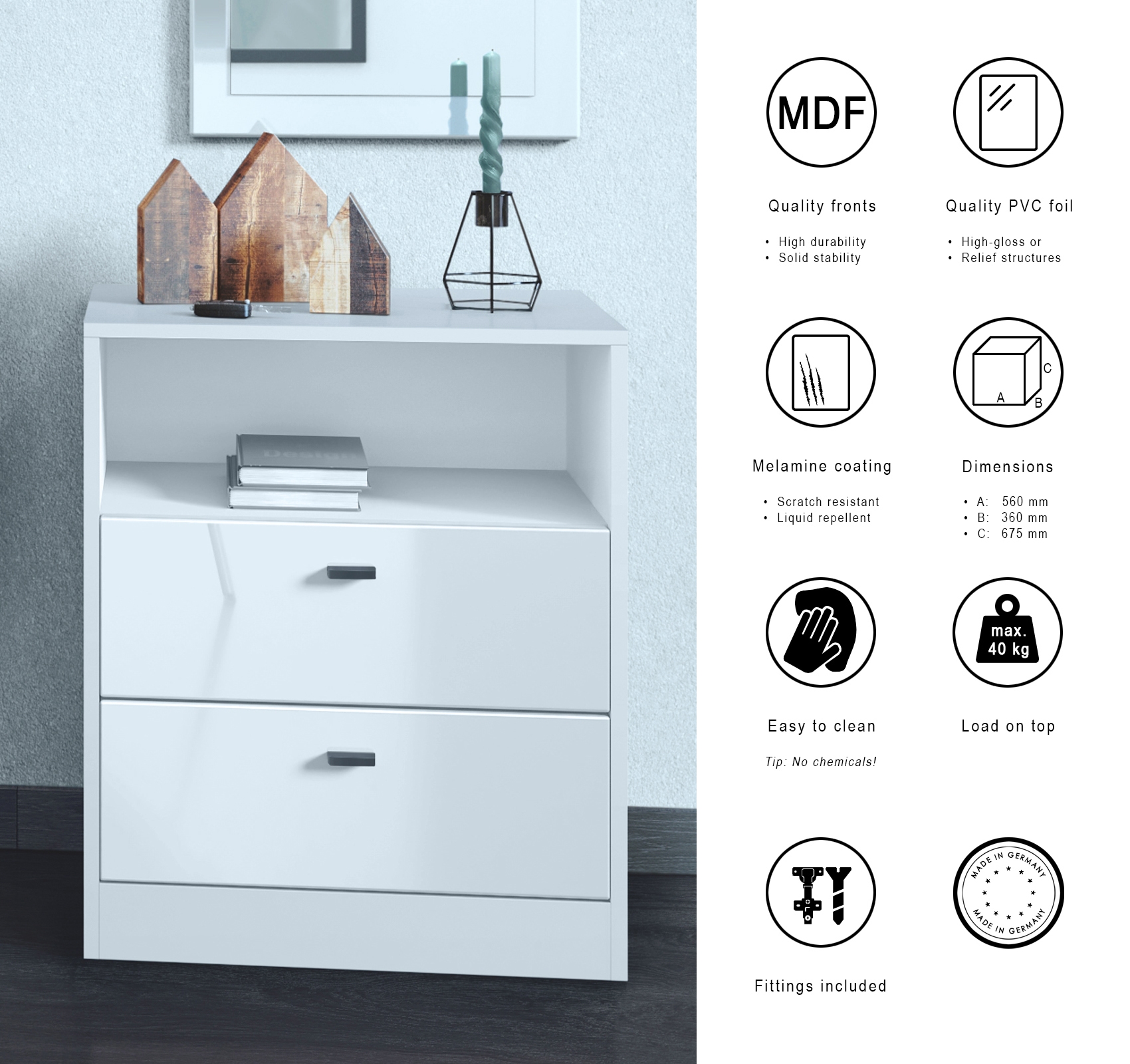 Durch das schlichte, moderne Design lässt sich die Kommode mit vielen verschiedenen Einrichtungsstilen kombinieren und sowohl als Wohnzimmerschrank, Kommode im Schlafzimmer oder als Präsentationsfläche für Deko-Objekte einsetzen. Für eine besondere Eleganz sorgen die Fronten der Schubladenkommode, erhältlich in vielen verschiedenen Farbvarianten, die Ihnen eine Vielzahl an Kombinationsmöglichkeiten bieten. Durch die Oberflächenbeschichtung erhalten Sie ein besonders pflegeleichtes Produkt. Für die Reinigung können Sie auf Chemie verzichten - es reicht ein leicht angefeuchtetes Tuch, um die wasserfeste Oberfläche angemessen zu reinigen.