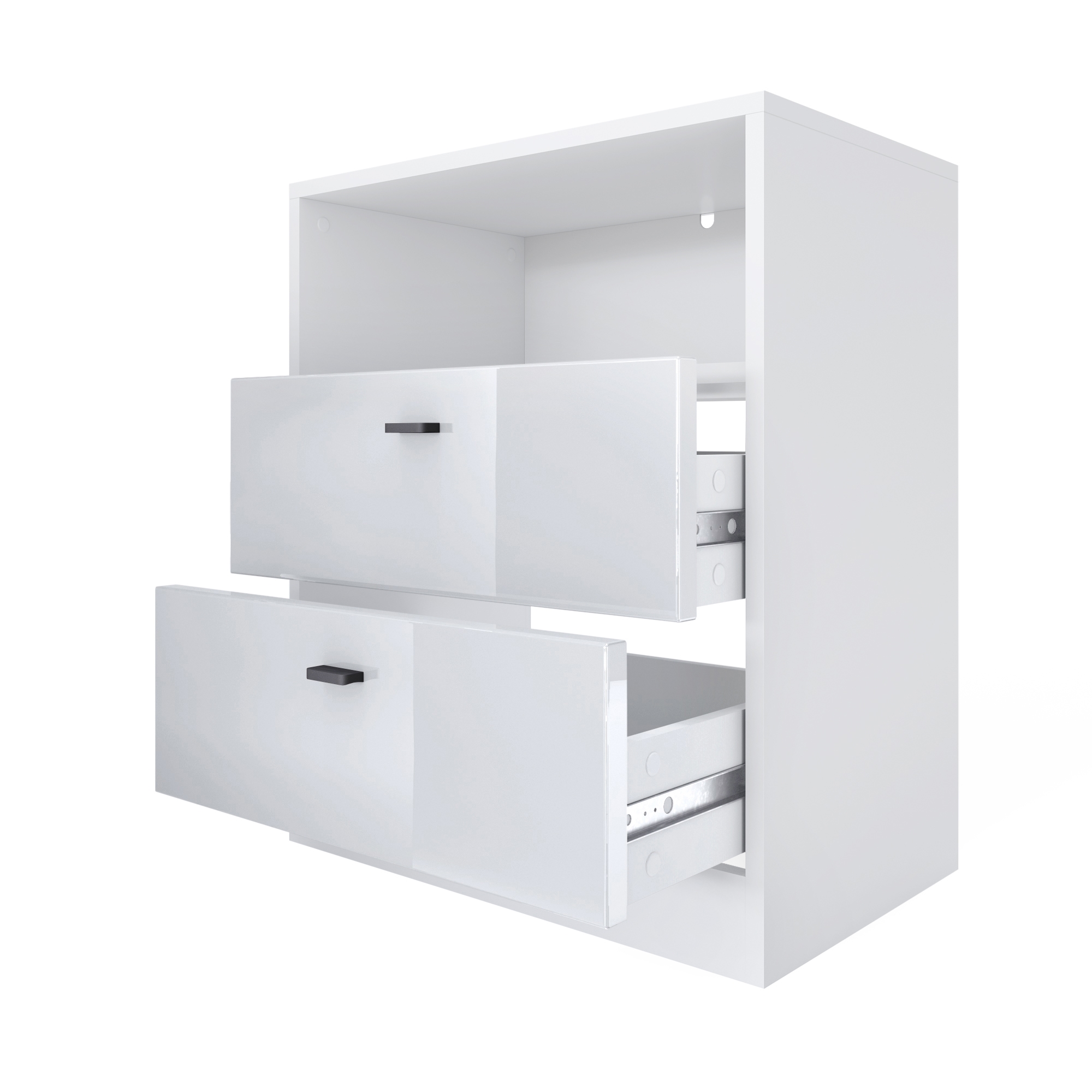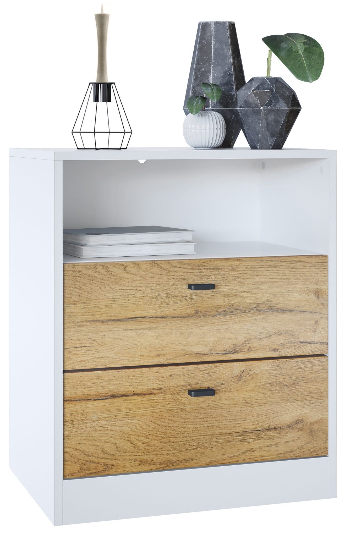 Produktinformationen "Pino V1 Kommode mit 2 Schubladen & 1 offenem Fach Weiß matt/Eiche Natur (56 x 67,5 x 36 cm)"