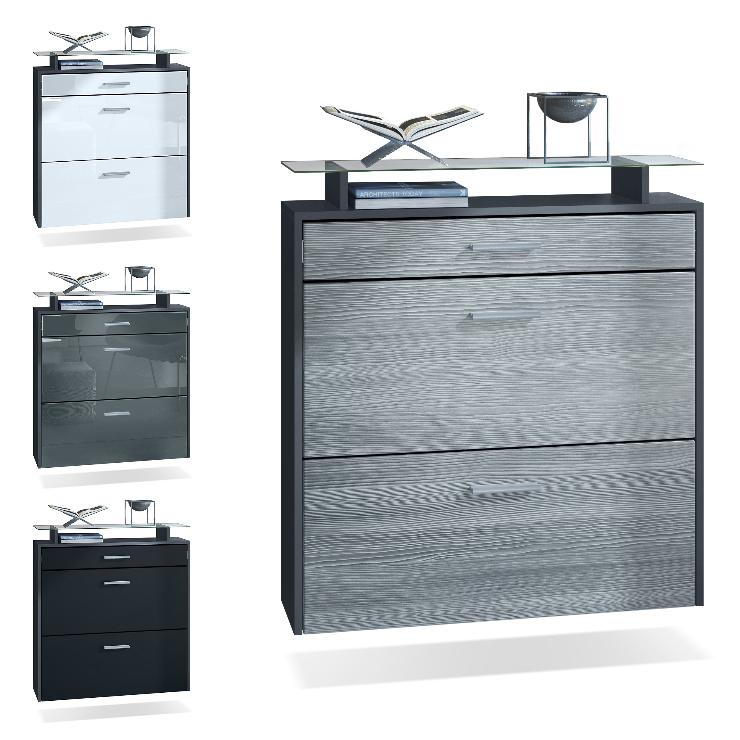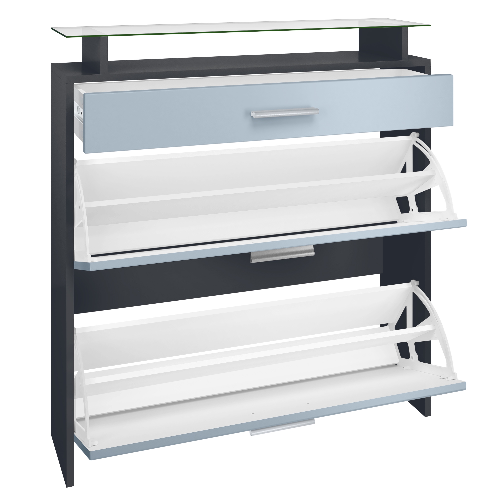Produktinformationen "Schuhschrank Malea mit 2 Klappen und 1 Schublade und Glasablage Anthrazit matt/Schwarz glänzend, mit Beleuchtung weiß(89x96x23 cm)"