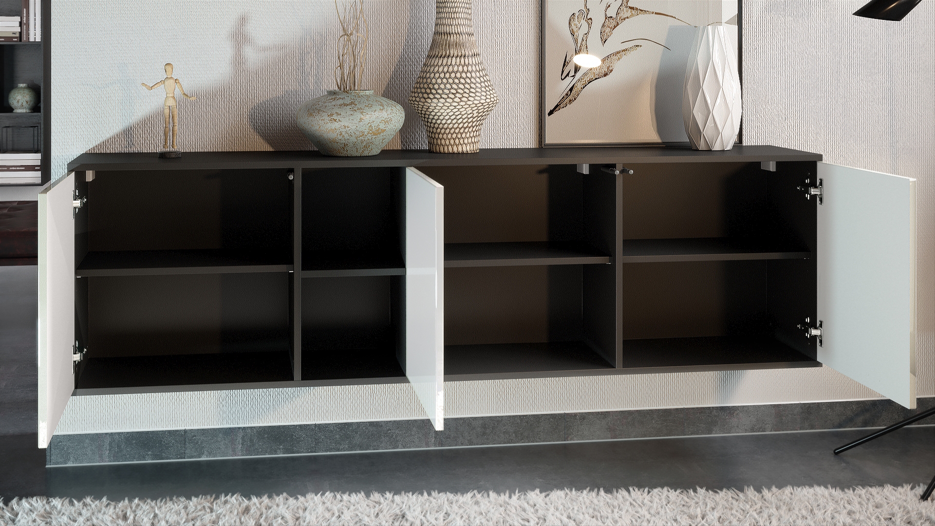 Produktinformationen "Sideboard Cuba mit 3 Türen und 2 offene Fächer Schwarz matt/Sandgrau Hochglanz inkl. LED-Beleuchtung (182x53x35 cm)"