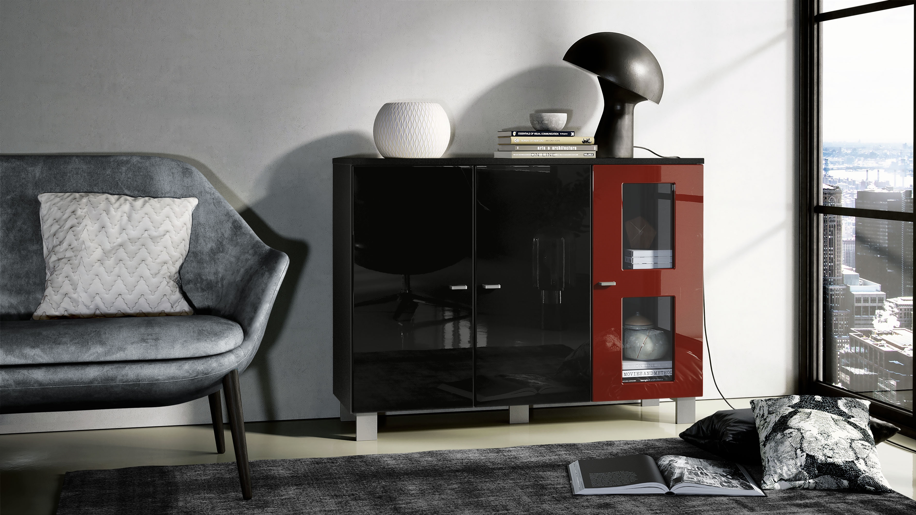 Produktinformationen "Sideboard Denjo mit 3 Türen Schwarz matt/Schwarz Hochglanz/Bordeaux Hochglanz (107 x 81 x 35 cm)"
