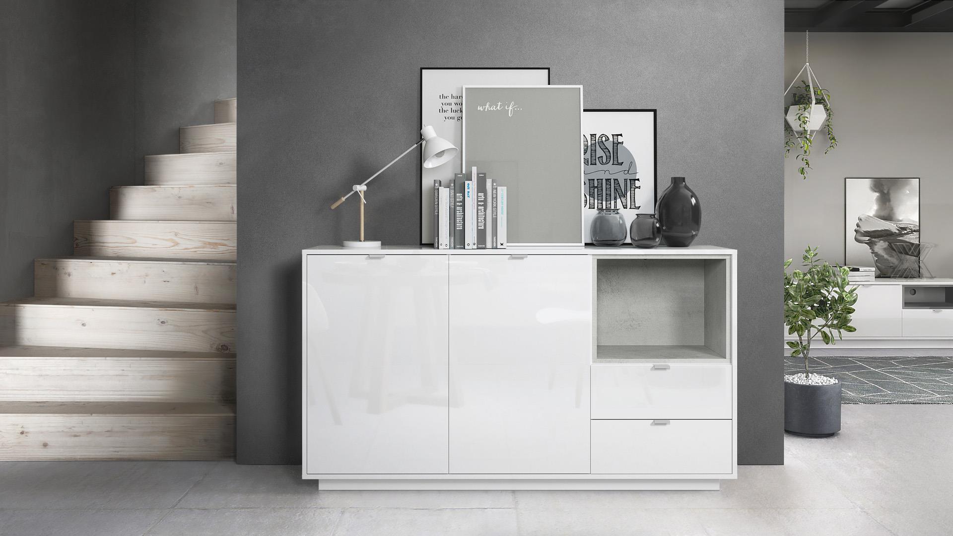 Produktinformationen "Sideboard Metro mit 2 Türen, 2 Schubladen und 1 offenem Fach Weiß Hochglanz/Beton Oxid Optik (153 x 88 x 38 cm)"