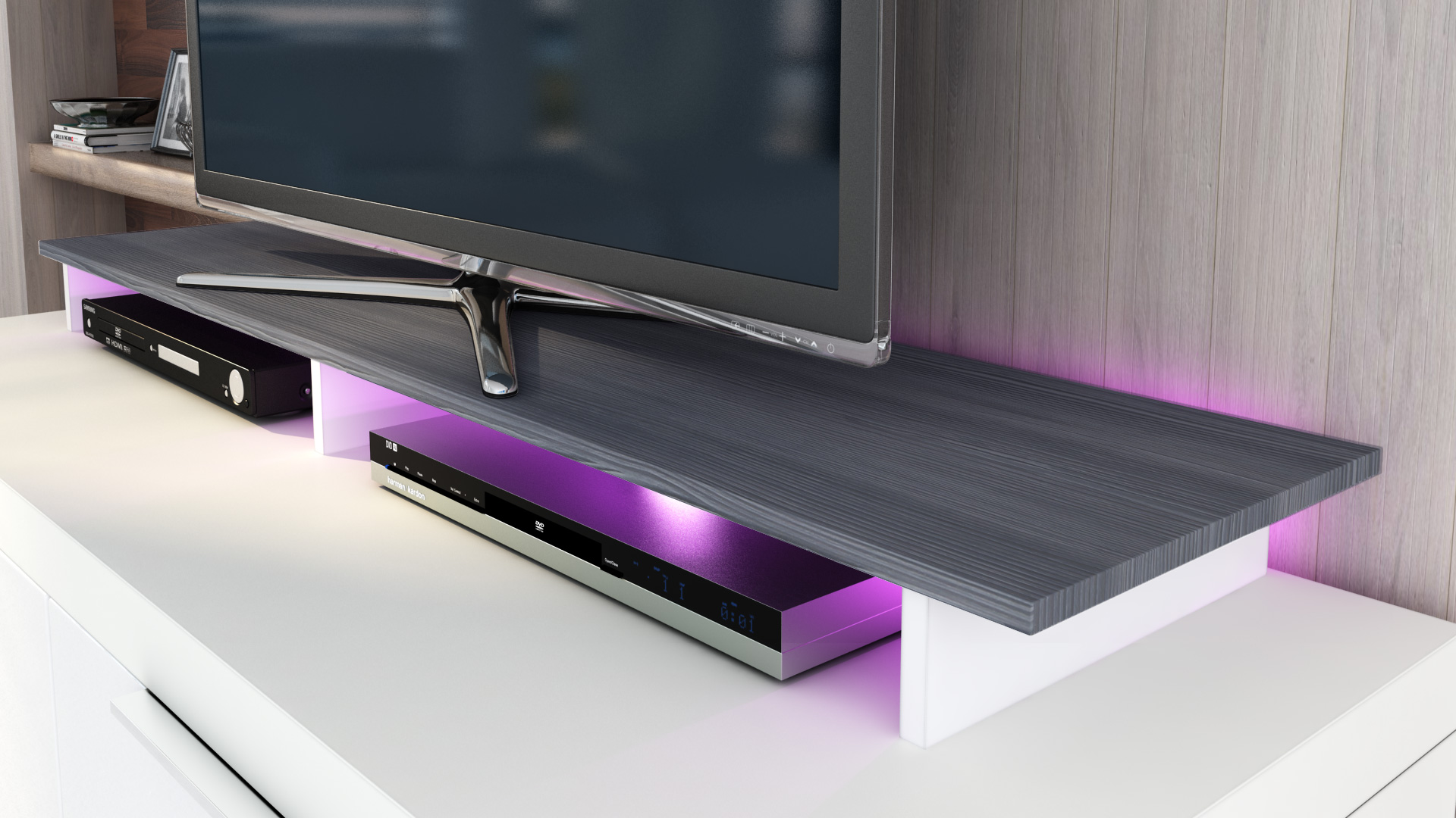 Der frei auflegbare TV-Aufsatz Game ist schlicht und modern und eignet sich perfekt als TV-Erhöhung für Ihr Lowboard oder Sideboard. Der Aufsatz ist nicht nur ein dekoratives Designelement, sondern erweist sich auch als praktische Ergänzung für Ihr Möbelstück, hergestellt in Deutschland. Zwischen den drei Aufsatzfüßen befinden sich zwei Fächer, die viel Stauraum für Ihren Receiver, Konsolen und Ähnliches bieten. Dank der einfachen Handhabung rücken Sie Ihren Fernseher mit der Monitorerhöhung in die richtige Position - für einen perfekten Blick. Die Absatzfüße so wie die Ablagefläche verfügen über abgerundete Kanten.