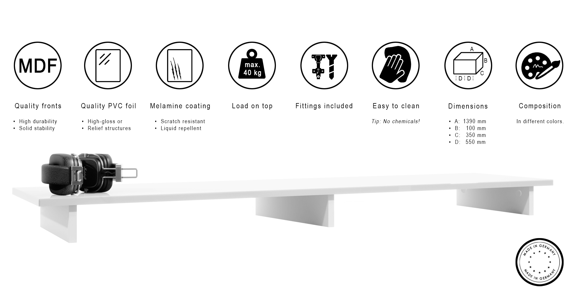 Durch das schlichte, moderne Design lässt sich der TV-Aufsatz mit vielen verschiedenen Einrichtungsstilen kombinieren und sowohl als Monitoraufsatz fürs TV-Board oder als Aufsatz fürs Sideboard im Wohnzimmer oder Schlafzimmer einsetzen. Für eine besondere Eleganz sorgt die Ablagefläche des Fernseher-Aufsatzes, erhältlich in vielen verschiedenen Farbvarianten, die Ihnen eine Vielzahl an Kombinationsmöglichkeiten bieten. Durch die Oberflächenbeschichtung erhalten Sie ein besonders pflegeleichtes Produkt. Für die Reinigung können Sie auf Chemie verzichten - es reicht ein leicht angefeuchtetes Tuch, um die wasserfeste Oberfläche angemessen zu reinigen.
