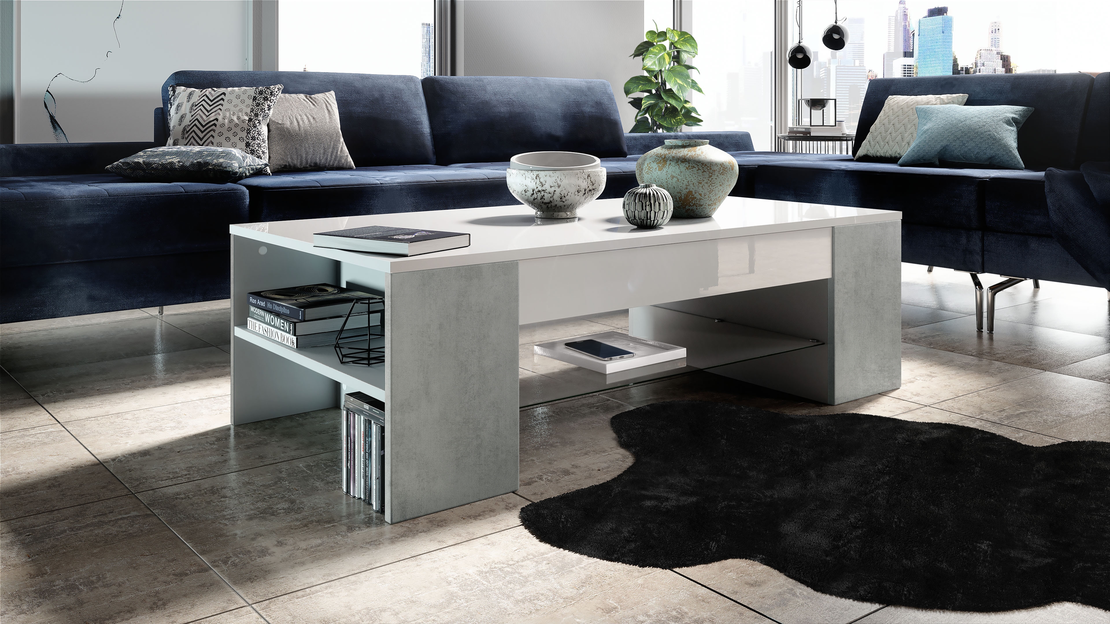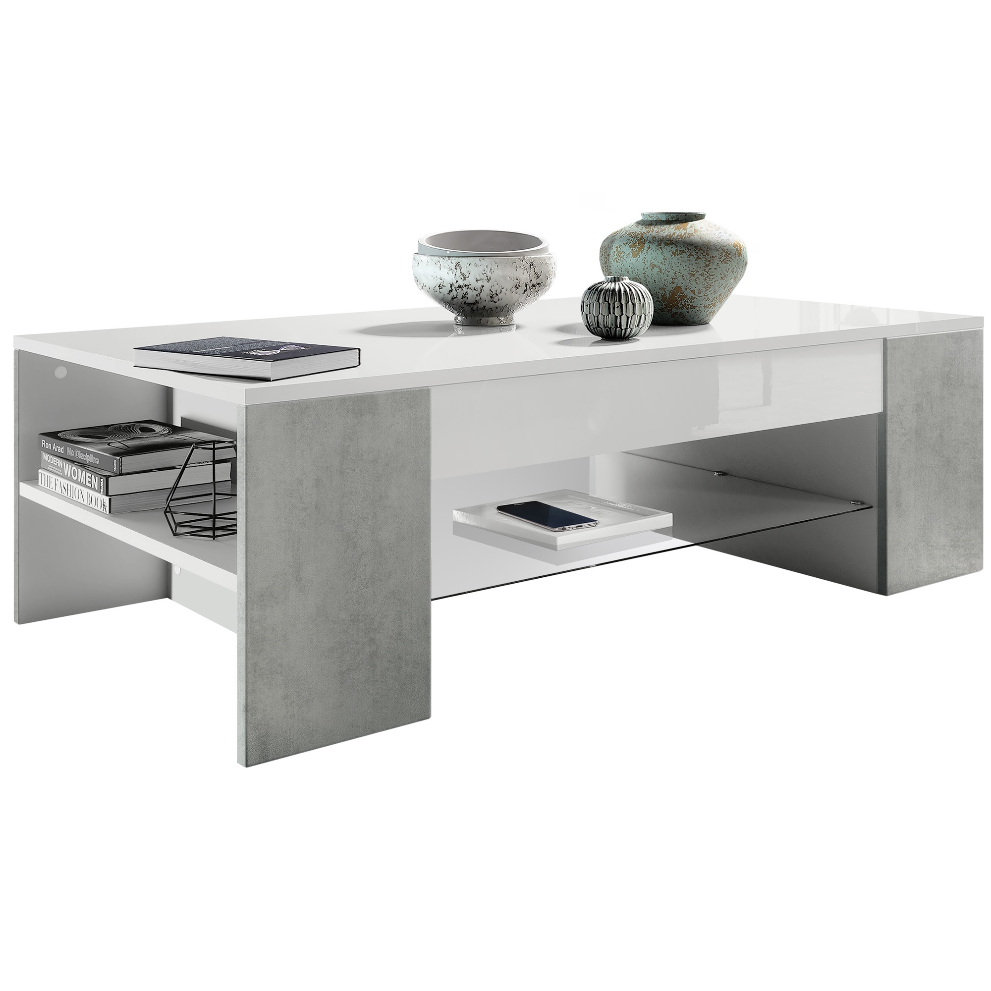 Durch das schlichte, moderne Design lässt sich der Beistelltisch mit vielen verschiedenen Einrichtungsstilen kombinieren und sowohl im Wohnzimmer, als auch in anderen Wohnräumen einsetzen. Für eine besondere Eleganz sorgen die Blenden des Sofatischs, erhältlich in vielen verschiedenen Farbvarianten, die Ihnen eine Vielzahl an Kombinationsmöglichkeiten bieten. Die Seitenteile und Tischplatte des Wohnzimmertischs sind in weiß Hochglanz und die seitlichen Ablagefächer in weiß matt. Durch die Oberflächenbeschichtung erhalten Sie ein pflegeleichtes Produkt. Für die Reinigung können Sie auf Chemie verzichten - es reicht ein leicht angefeuchtetes Tuch, um die wasserfeste Oberfläche angemessen zu reinigen. Achten Sie darauf, die Tischplatte keiner starken Hitze auszusetzen, da es zu Empfindlichkeiten der Oberfläche kommen kann.