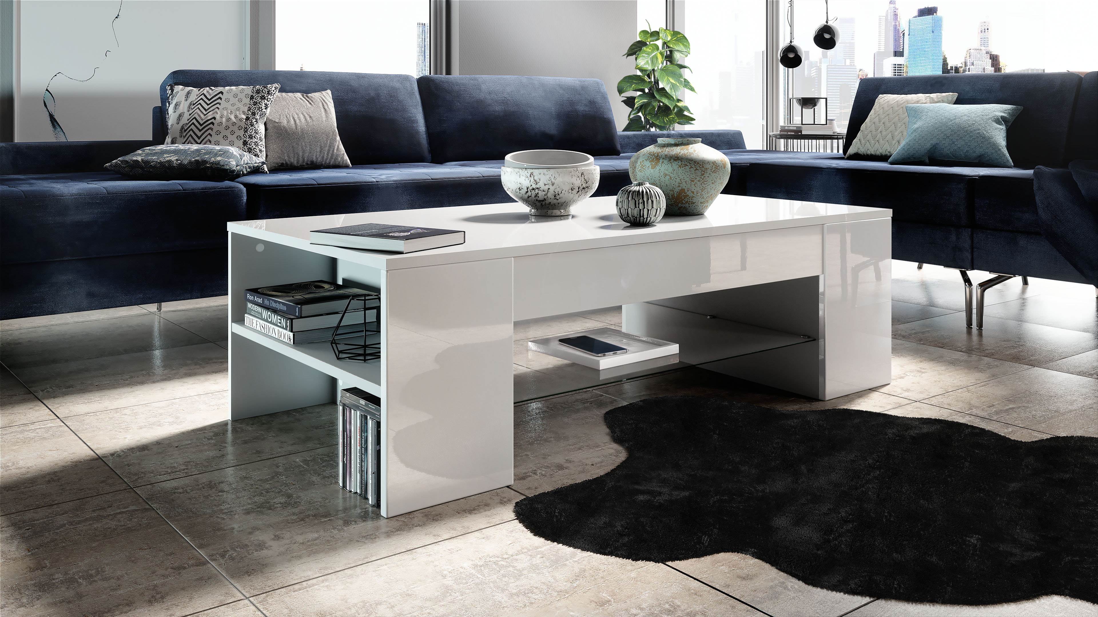 Durch das schlichte, moderne Design lässt sich der Beistelltisch mit vielen verschiedenen Einrichtungsstilen kombinieren und sowohl im Wohnzimmer, als auch in anderen Wohnräumen einsetzen. Für eine besondere Eleganz sorgen die Blenden des Sofatischs, erhältlich in vielen verschiedenen Farbvarianten, die Ihnen eine Vielzahl an Kombinationsmöglichkeiten bieten. Die Seitenteile und Tischplatte des Wohnzimmertischs sind in weiß Hochglanz und die seitlichen Ablagefächer in weiß matt. Durch die Oberflächenbeschichtung erhalten Sie ein pflegeleichtes Produkt. Für die Reinigung können Sie auf Chemie verzichten - es reicht ein leicht angefeuchtetes Tuch, um die wasserfeste Oberfläche angemessen zu reinigen. Achten Sie darauf, die Tischplatte keiner starken Hitze auszusetzen, da es zu Empfindlichkeiten der Oberfläche kommen kann.
