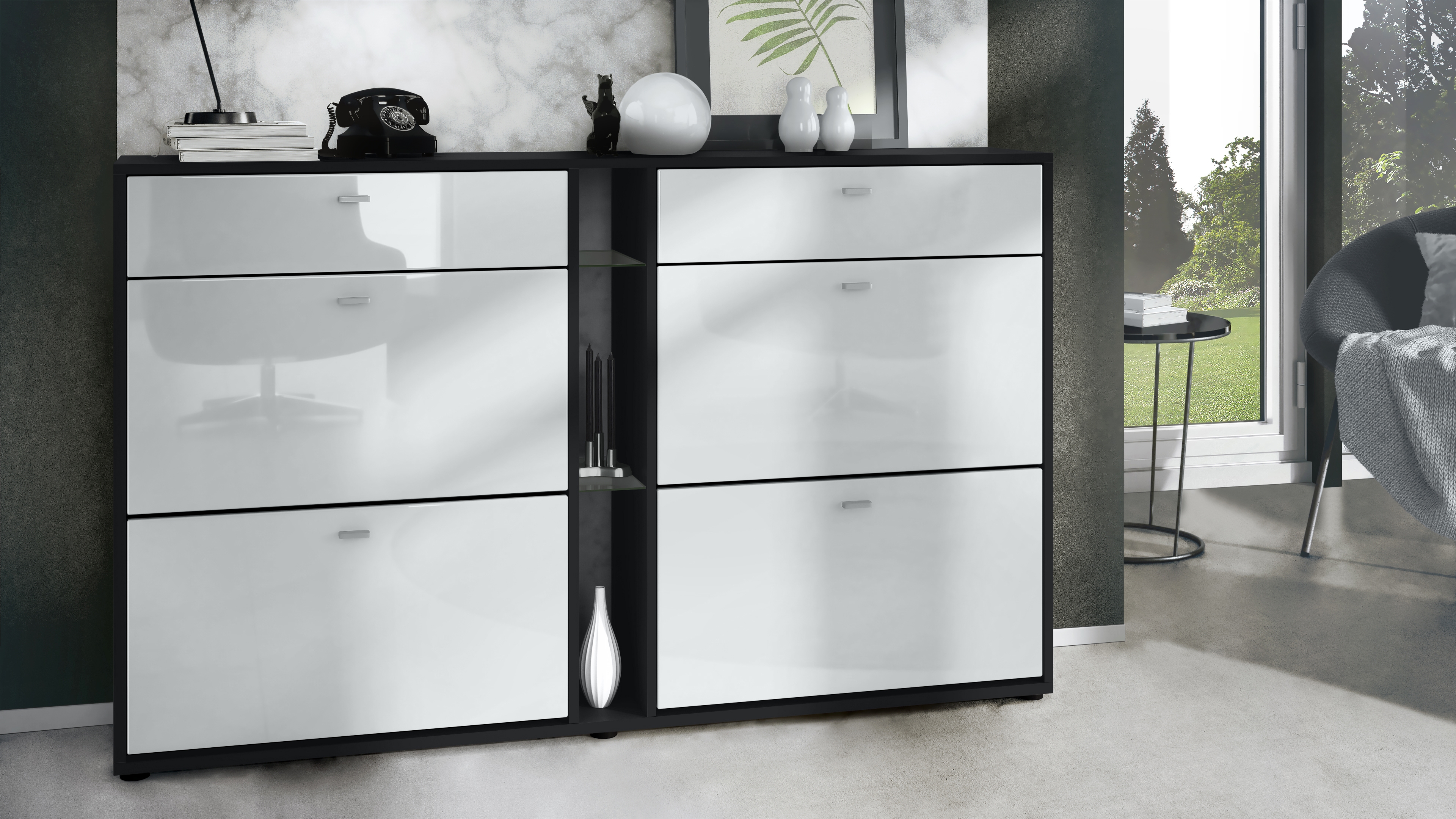 Produktinformationen "Today Schuhschrank 2 Schubladen und 3 offene Fächer Schwarz matt/Weiß Hochglanz (155,5 x 95 x 28 cm)"