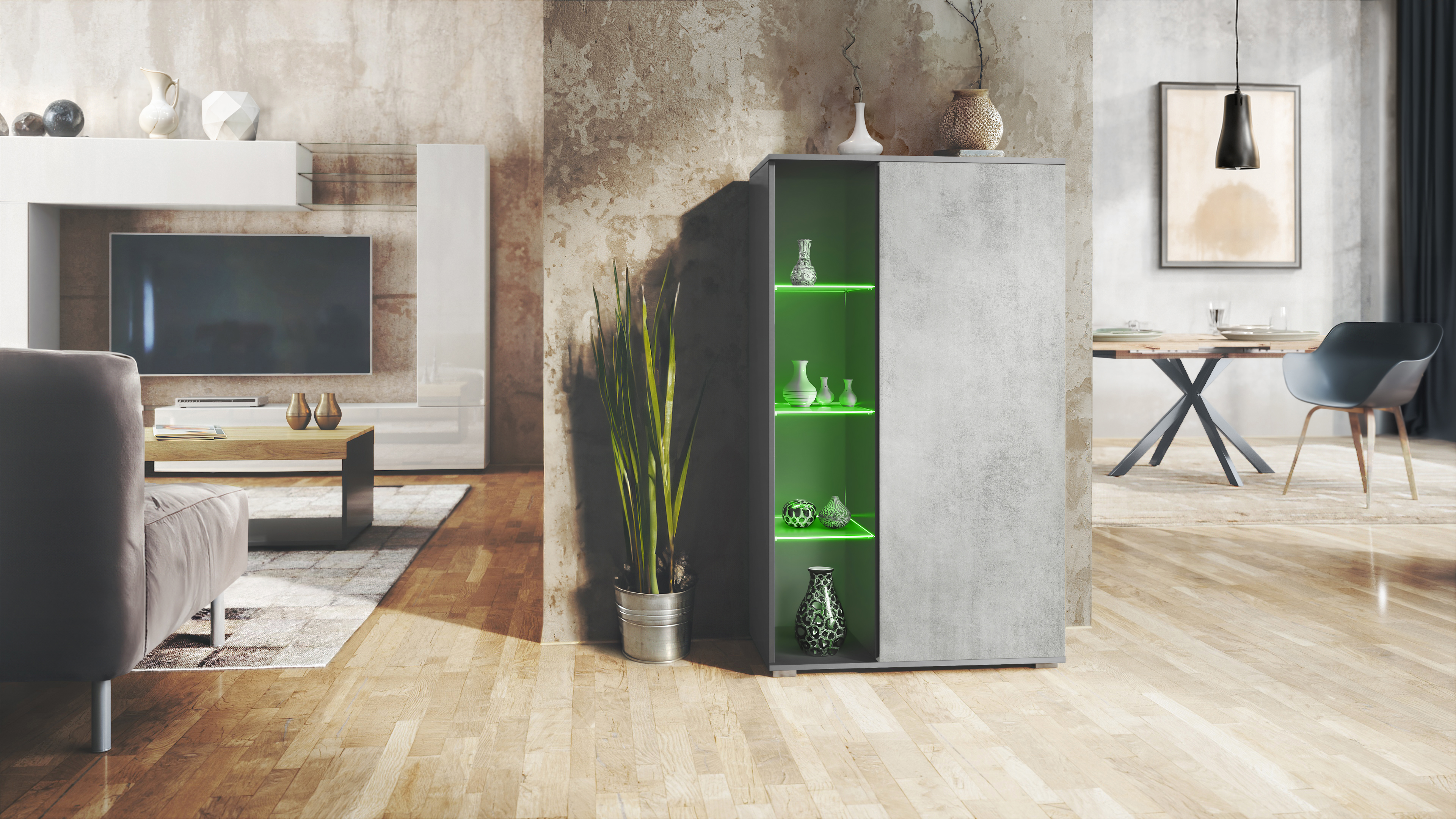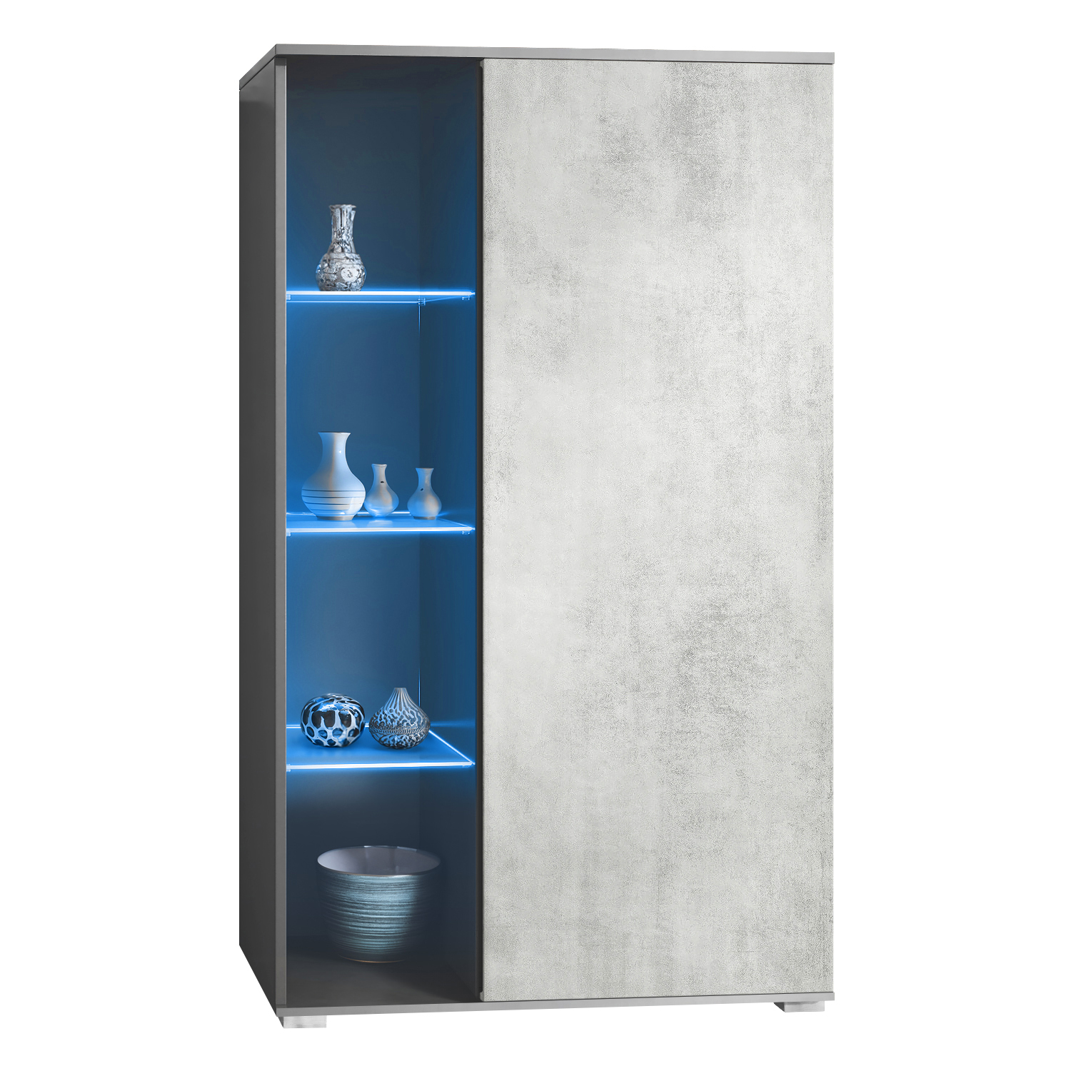 Produktinformationen "Vitrine Davos mit 3 Glasböden und 8 Fächer inkl. LED Anthrazit matt/Beton Oxid Optik (71,5 x 134 x 35 cm)"