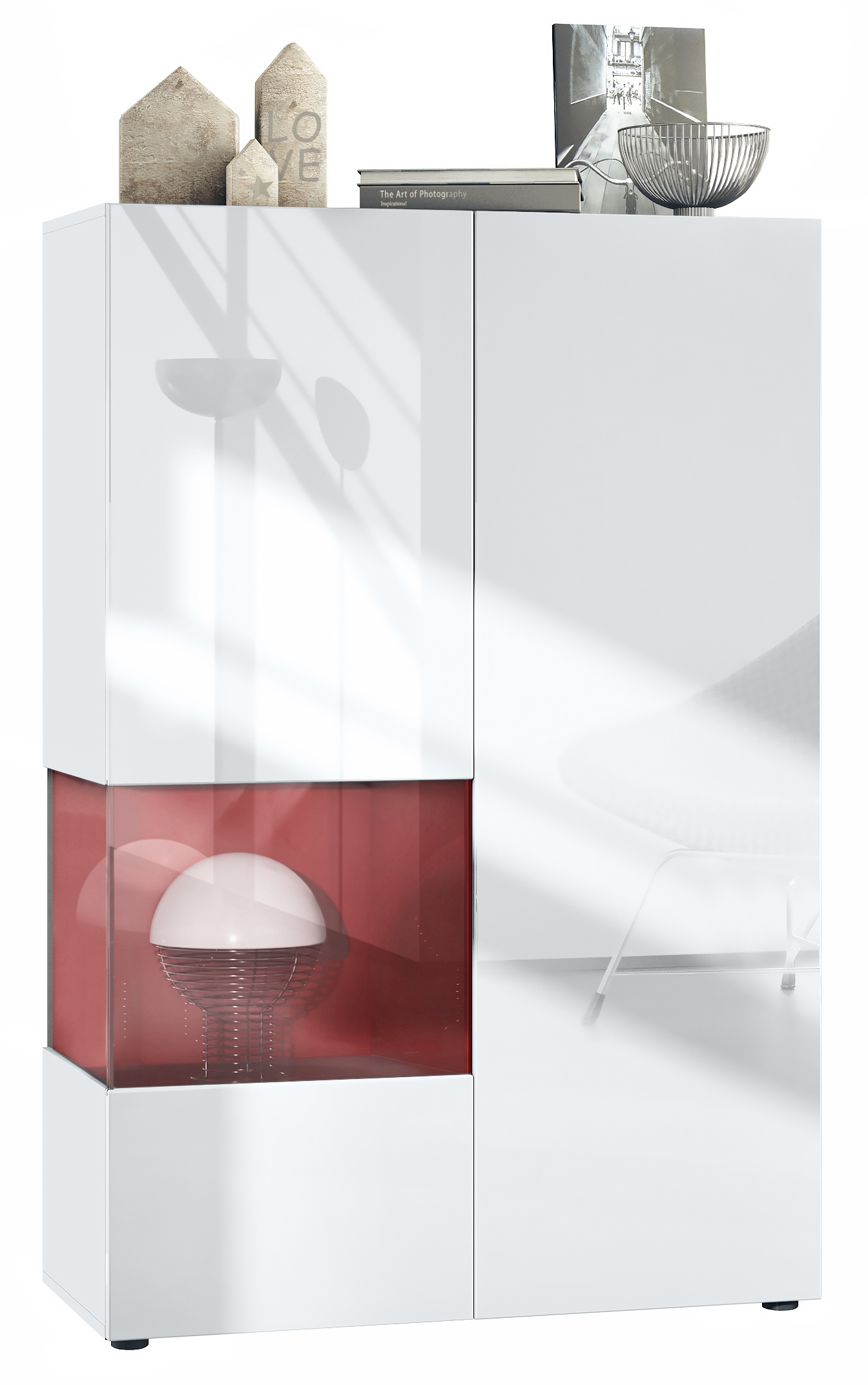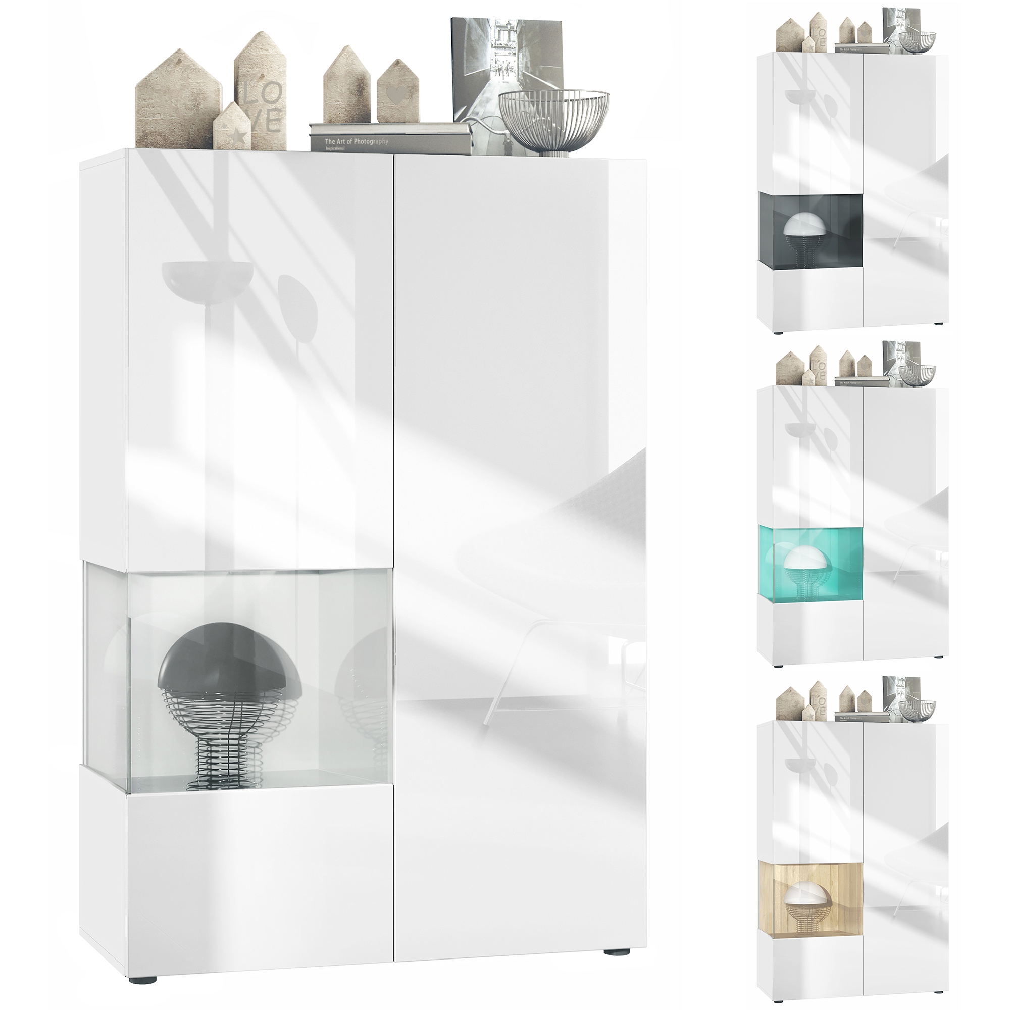 Der Vitrinenschrank Morena V2 eignet sich perfekt für jeden Wohnraum und ist dazu noch ein echter Eye-Catcher. Die geräumige Vitrine präsentiert sich als praktisches Möbelstück mit modernem Design, hergestellt in Deutschland. Die Glasvitrine ist mit zwei Türen ausgestattet, hinter denen sich insgesamt 7 Fächer verbergen. Eine der Türen ist mit einem dekorativen Einsatz aus ESG-Sicherheitsglas versehen, durch den man das sich farblich vom Rest der Vitrine abhebende Fach sehen kann. Dieses kreativ eingesetzte farbige Fach sorgt in Kombination mit den hochglänzenden weißen Türen für eine besondere Eleganz. Der Cube ist in vielen verschiedenen Farbvarianten erhältlich. Das Glasfenster kann optional mit einer LED-Beleuchtung mit weißem Licht bestückt werden. Der Vitrinenschrank ist mit einer Rückwand in Holzoptik aus Hartfaserplatten ausgestattet.