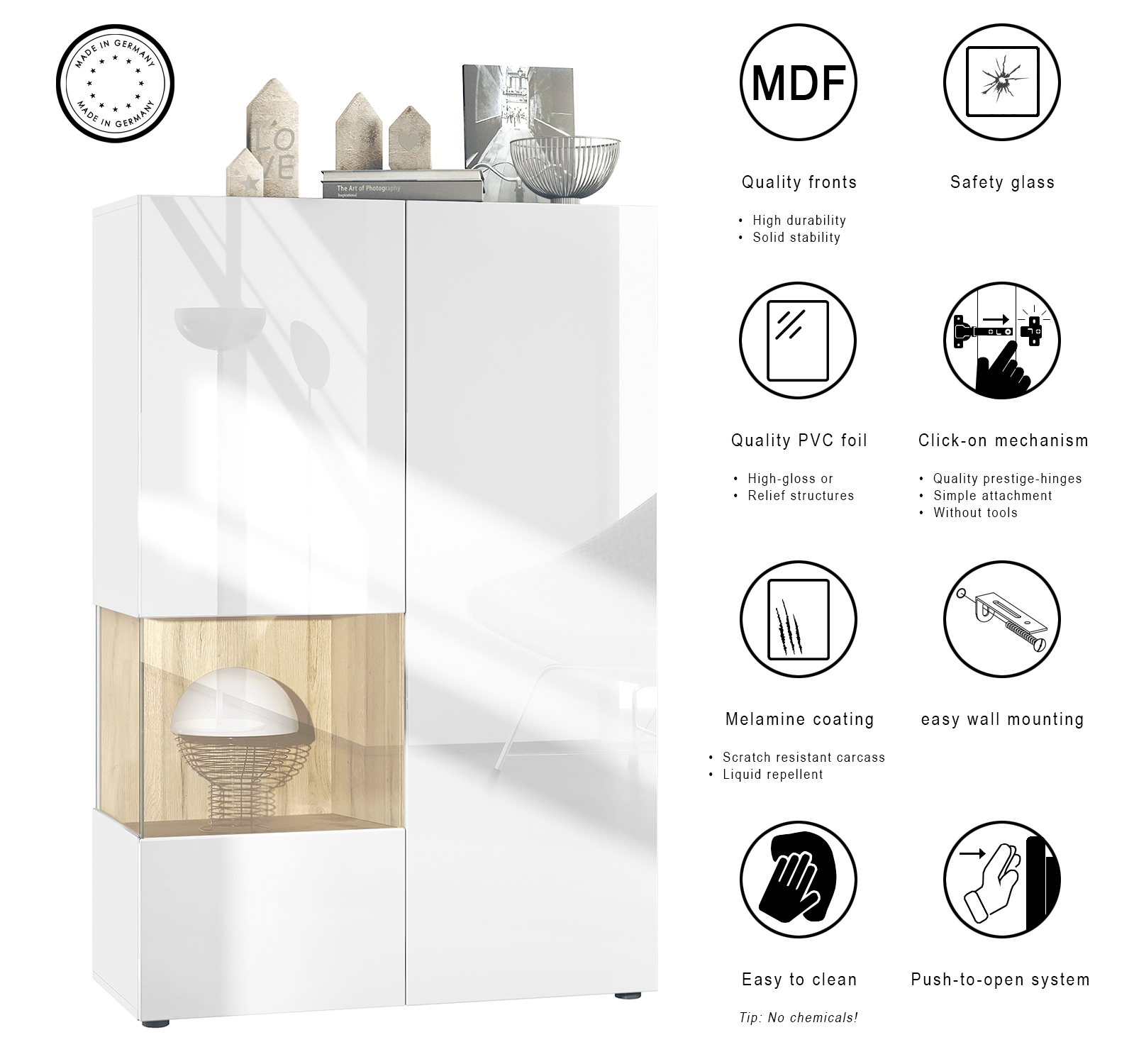 Durch das schlichte, moderne Design lässt sich der Vitrinenschrank mit vielen verschiedenen Einrichtungsstilen kombinieren und sowohl als Vitrine im Wohnzimmer, Flur oder im Gästezimmer einsetzen. Durch die Oberflächenbeschichtung erhalten Sie ein besonders pflegeleichtes Produkt. Für die Reinigung können Sie auf Chemie verzichten - es reicht ein leicht angefeuchtetes Tuch, um die wasserfeste Oberfläche angemessen zu reinigen.