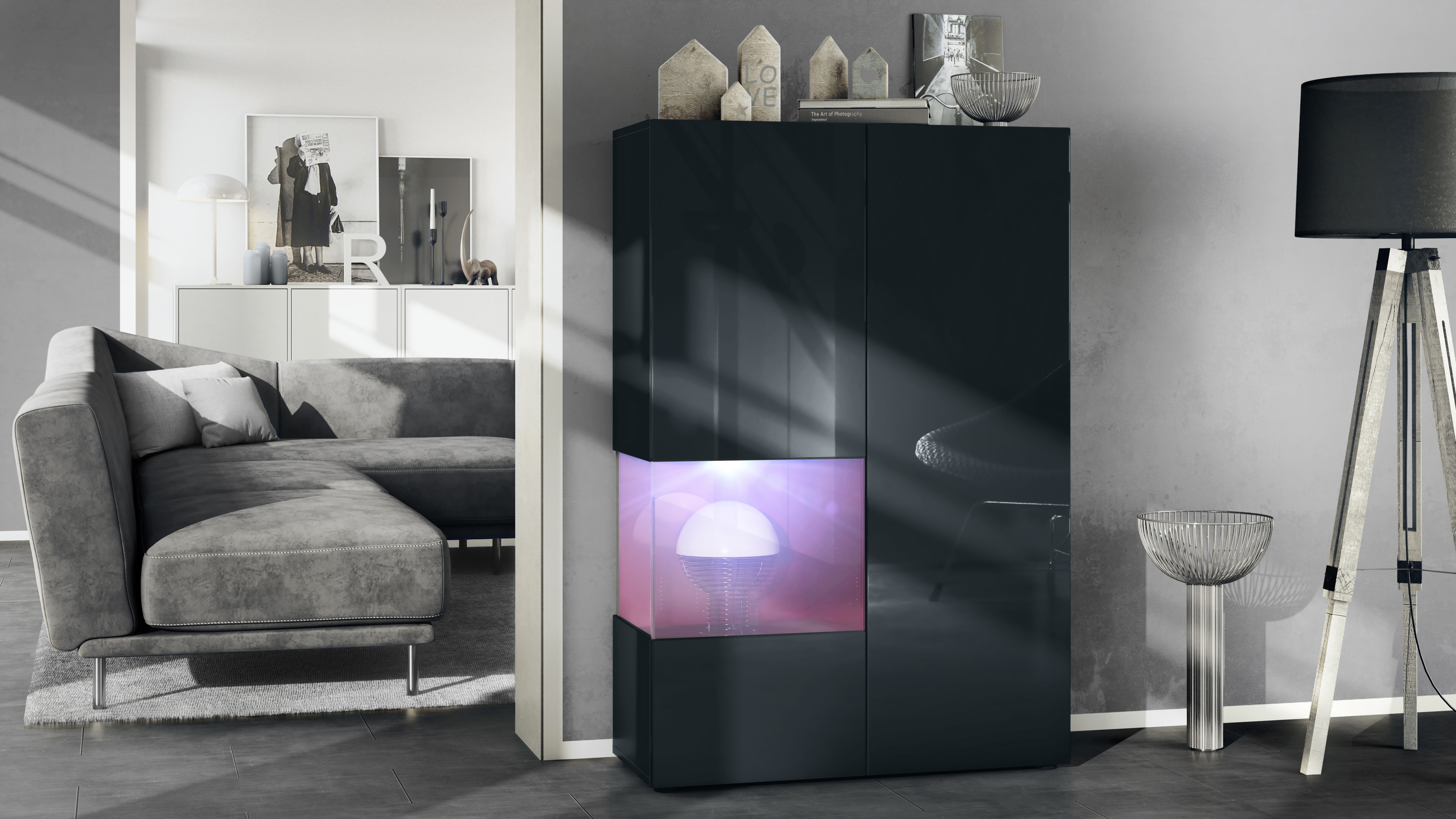 Der Vitrinenschrank Morena V2 eignet sich perfekt für jeden Wohnraum und ist dazu noch ein echter Eye-Catcher. Die geräumige Vitrine präsentiert sich als praktisches Möbelstück mit modernem Design, hergestellt in Deutschland. Die Glasvitrine ist mit zwei Türen ausgestattet, hinter denen sich insgesamt 7 Fächer verbergen. Eine der Türen ist mit einem dekorativen Einsatz aus ESG-Sicherheitsglas versehen, durch den man das sich farblich vom Rest der Vitrine abhebende Fach sehen kann. Dieses kreativ eingesetzte farbige Fach sorgt in Kombination mit den hochglänzenden schwarzen Türen für eine besondere Eleganz. Der Cube ist in vielen verschiedenen Farbvarianten erhältlich. Das Glasfenster kann optional mit einer LED-Beleuchtung mit weißem Licht bestückt werden. Der Vitrinenschrank ist mit einer Rückwand in Holzoptik aus Hartfaserplatten ausgestattet.
