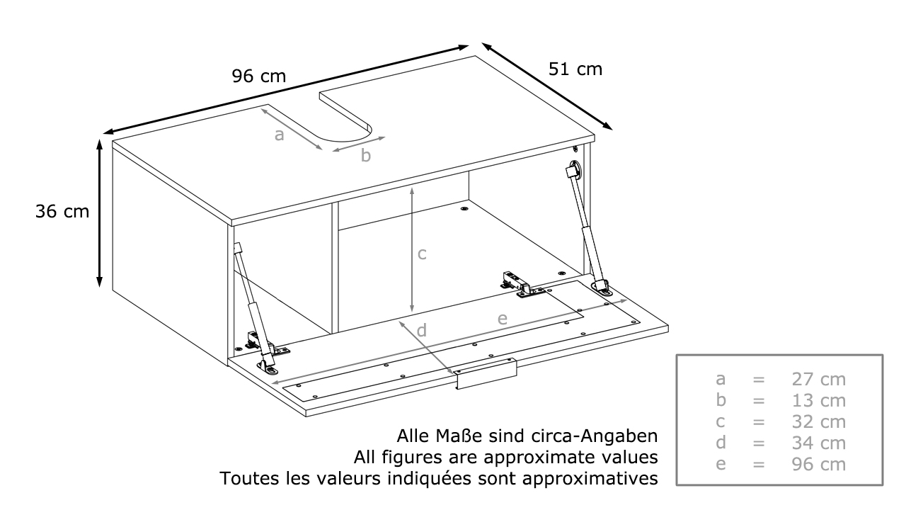 Maße des Waschbeckenunterschranks in cm (BxHxT): 96 x 36 x 51