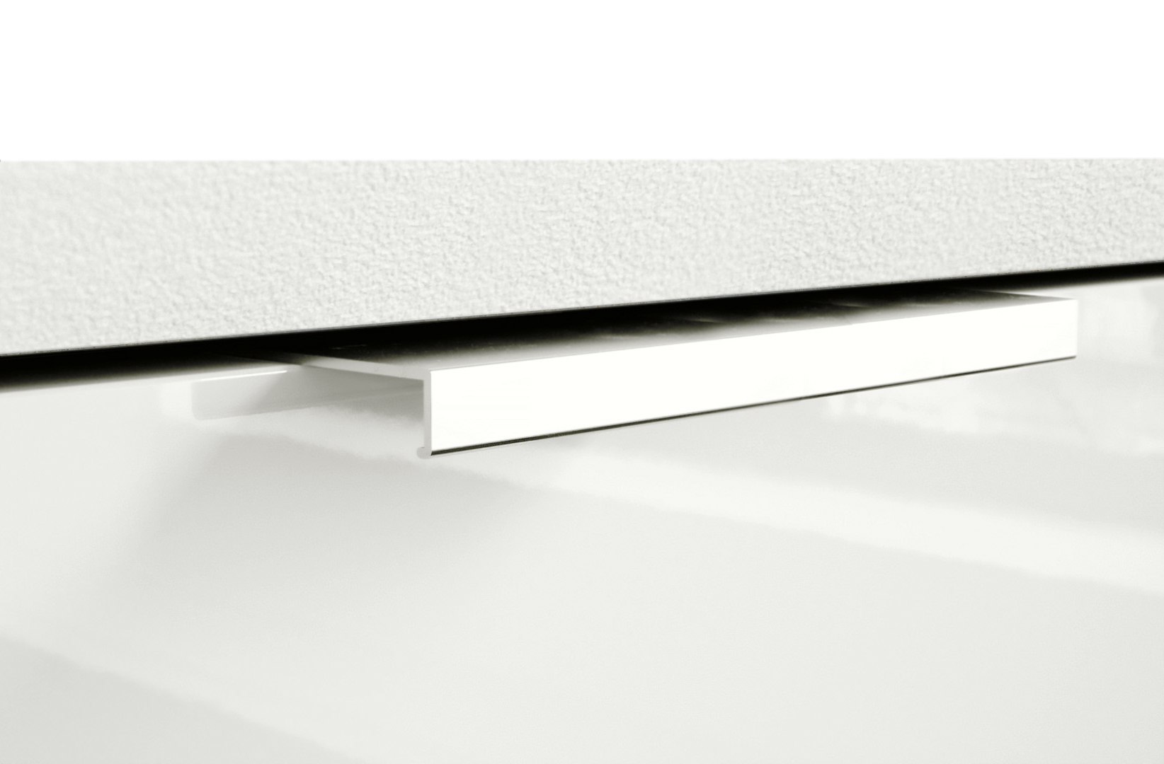 Der Korpus (Oberböden und Seiten) des Unterschranks sind in einem matten Weiß gehalten. Die Front besteht aus MDF und ist in Weiß Hochglanz mit abgerundeten Kanten verfügbar. Die Absetzungen sind in verschiedenen Trendfarben erhältlich.