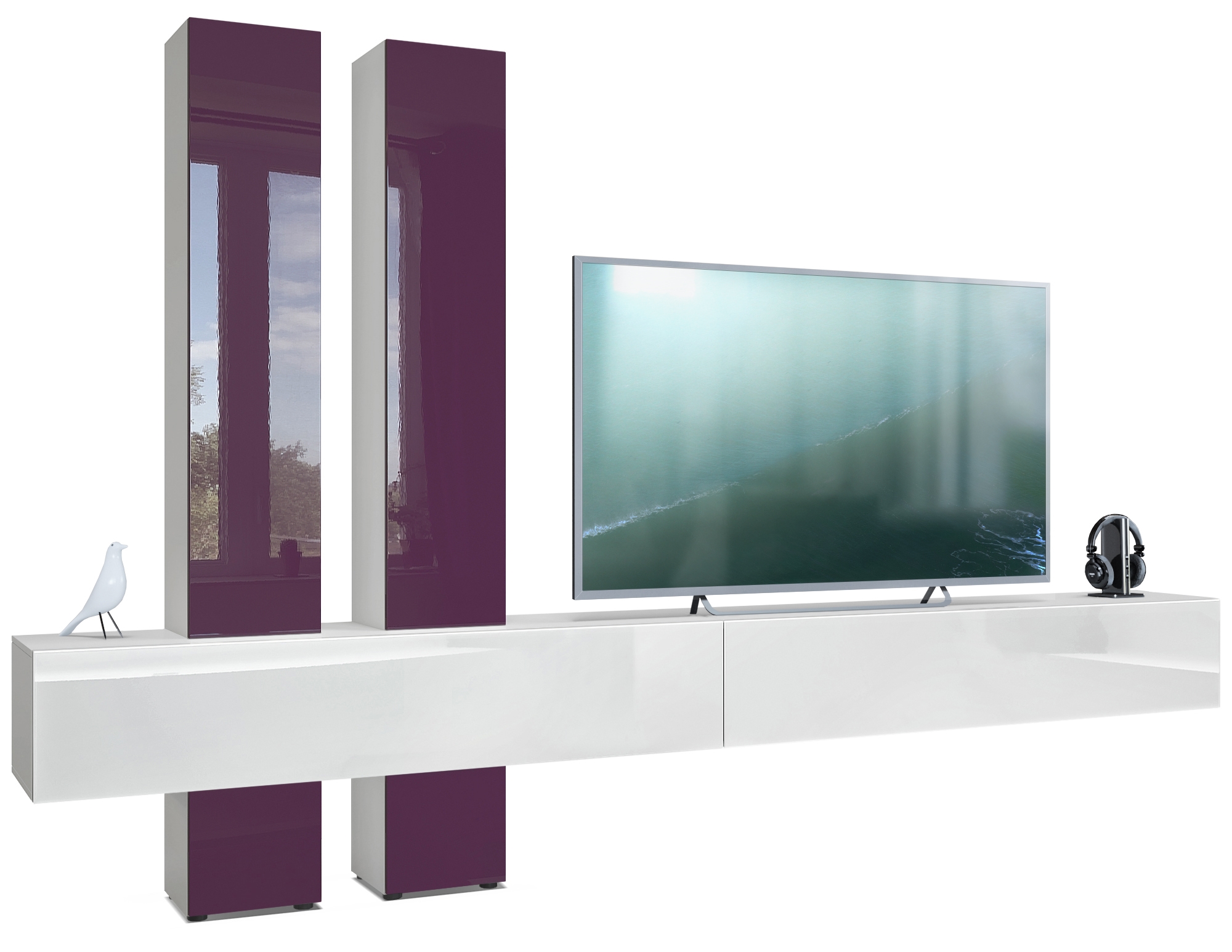 Produktinformationen "Wohnwand Moja mit Rückwand mit 4 Türen und 2 Klappen Weiß matt/Weiß Hochglanz und Brombeer Hochglanz (330 x 204 x 39 cm)"