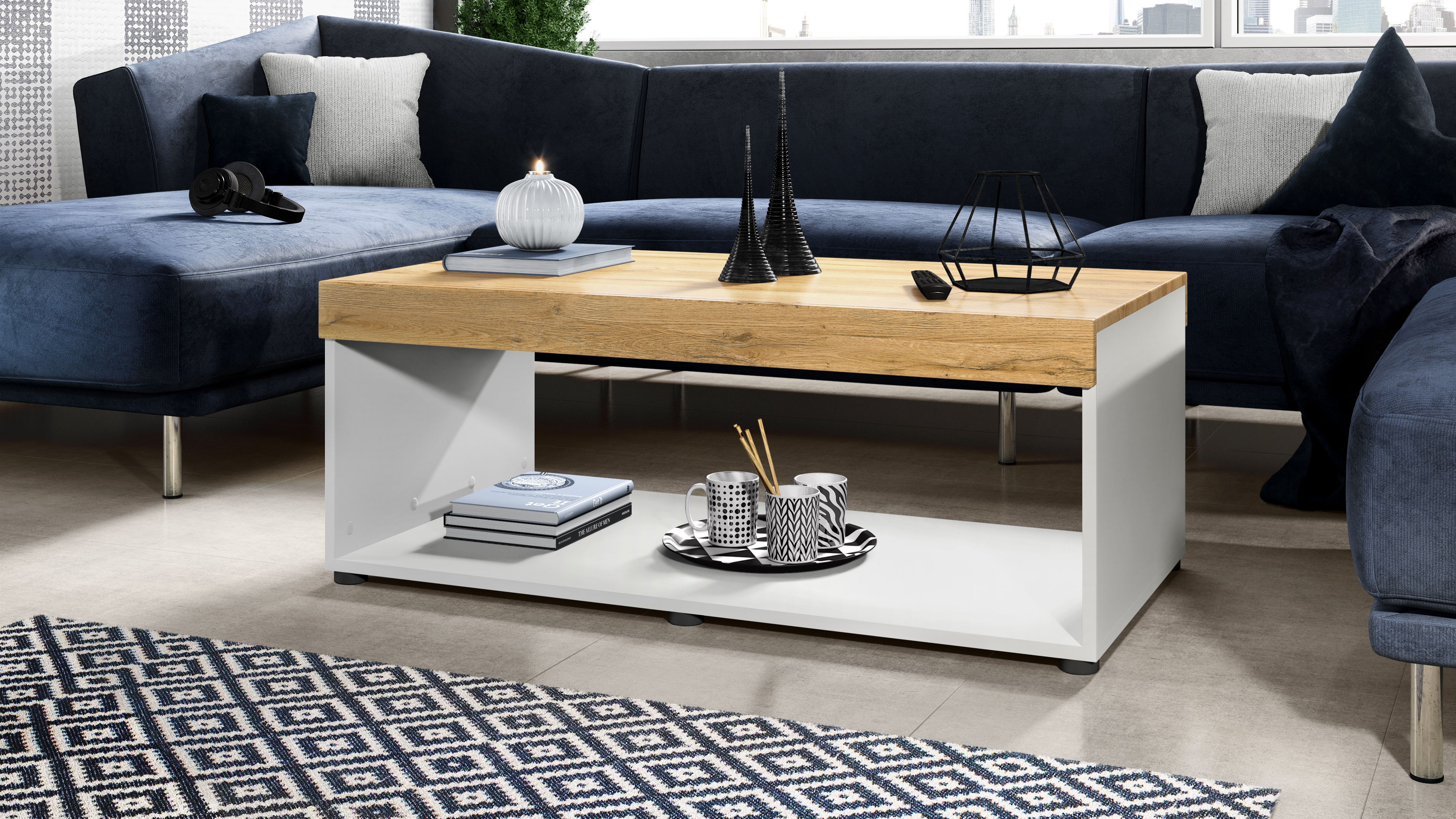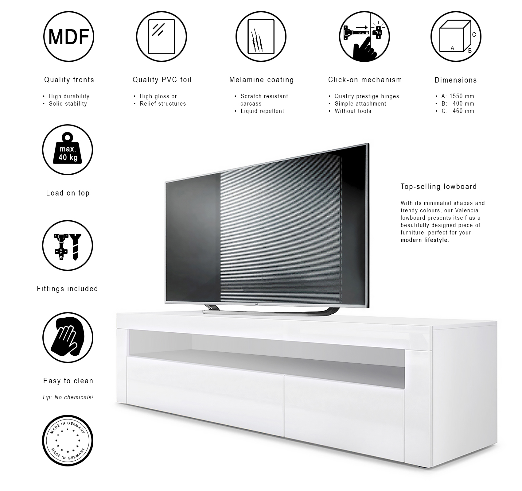 Das Wohnzimmer-Set Berlin überzeugt mit modernem Design und hochwertiger Verarbeitung. Es umfasst ein vielseitiges TV-Lowboard und einen eleganten Wohnzimmertisch, die sich harmonisch in verschiedene Einrichtungsstile integrieren. Die Möbel sind pflegeleicht und aus hochwertigen Materialien in Deutschland gefertigt. Das TV-Lowboard kombiniert elegantes Design mit hoher Funktionalität und bietet großzügigen Stauraum für Multimedia-Geräte. Es hat ein großes und ein kleines Fach mit Klappen sowie ein offenes Ablagefach. Die Klappen lassen sich einfach öffnen und sind durch Metallfangbänder gesichert. Der Oberboden bietet Platz für große Fernseher. Das TV-Lowboard misst 155 x 46 x 40 cm (BxHxT), das offene Fach 139 x 13 x 36 cm, das kleine Fach 46 x 24 x 36 cm und das große Fach 92 x 24 x 36 cm. Es wiegt 33 kg und hat eine maximale Tragfähigkeit von 30 kg. Der Wohnzimmertisch des Sets Berlin bietet mit einer großzügigen Tischplatte und einem Ablagefach zusätzlichen Stauraum für Zeitschriften, Fernbedienungen oder Dekoration. Die Oberfläche ist wasserfest und lässt sich leicht reinigen. Achten Sie darauf, die Tischplatte nicht starker Hitze auszusetzen. Der Tisch misst 104 x 40,5 x 58 cm (BxHxT), das Ablagefach 100,5 x 35,5 x 55 cm und die Blende 104 x 7,5 cm (BxH). Er wiegt 21 kg und hat eine maximale Tragfähigkeit von 30 kg. Das Set wird mit Aufbauanleitungen und Montagematerial geliefert. Das Wohnzimmer-Set Berlin steht für modernes, elegantes Design, das hohe Funktionalität mit anspruchsvoller Optik verbindet – perfekt für jeden Wohnraum.